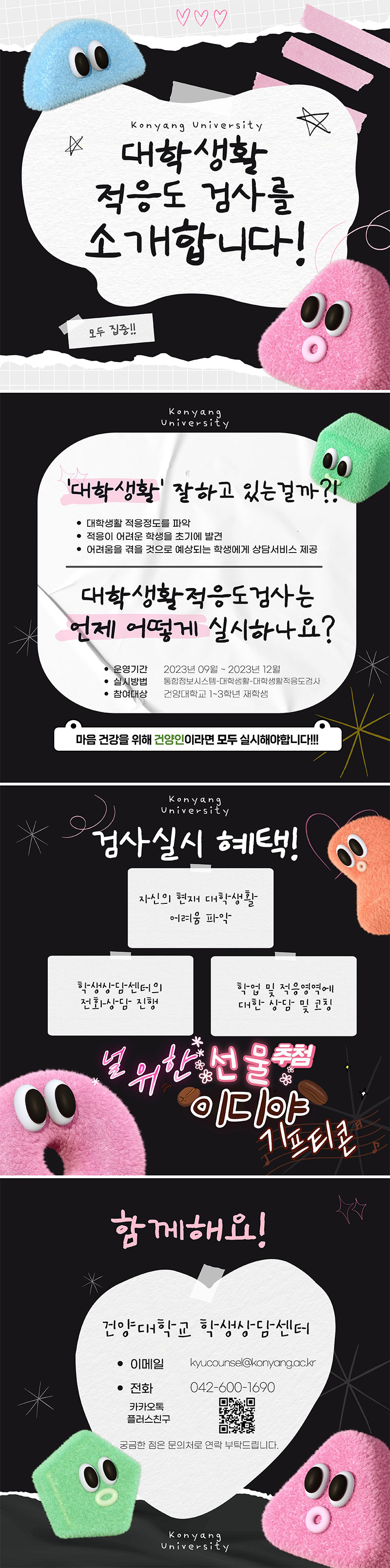 학생상담센터에서는 대학생활적응도검사를 실시 및 운영하고자 합니다. 대상 학생들이 적극적으로 대학생활적응도검사 프로그램에 참여하여 주시기 바랍니다. 가. 주 제 : 대학생활적응도검사 나. 시행목적 : 1) 재학생의 심리적 위기를 조기 발견하고 개입하여 심리지원서비스 활성화 2) 학과별 검사 결과분석을 통해, ‘지도교수-전문가’ 듀얼케어 체계를 통한 지원 제공 3) 환류시스템을 활용한 심리적 위기 학생들의 학생상담센터 인식제고 및 안정감 제고 다. 기 간 : 2023.09.04.(월). ~ 2023.10.27.(금) 라. 대 상 : 1~3학년 재학생 전원 마. 내 용 : 대학생활적응도검사를 활용한 대학생활 적응수준 파악 및 도움이 필요한 학생에게 맞춤형 심리상담 서비스 제공 |