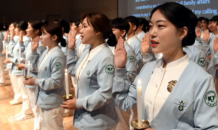 6일 대전 서구 관저동 건양대학교 메디컬캠퍼스에서 간호대학 졸업메달 수여 및 나이팅게일 선서식이 열려 4학년 학생들이 환자들을 위한 헌신과 봉사, 희생정신을 상징하는 촛불을 들고 선서를 하고 있다. 이성희 기자 token77@ |
