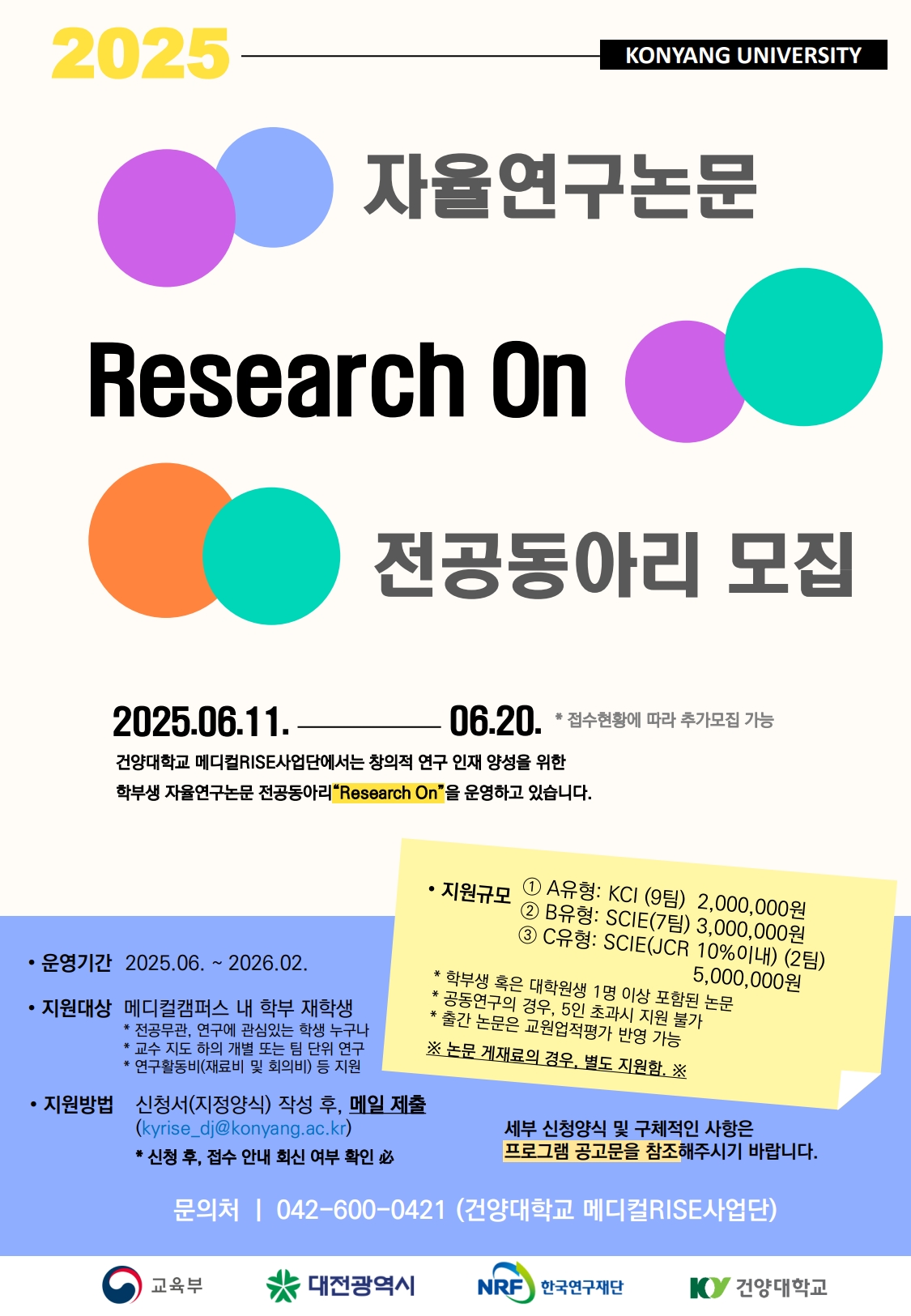 1) 모집기간: 2025.06.11.(수) ~ 06.20.(금) 2) 모집대상: 메디컬캠퍼스 소속 지도교수 및 재학생 (최대 5명, 휴학생(학기 중도 휴학 포함) 지원불가) 3) 지원내용: 연구활동비(재료비 및 회의비 등) * 논문 게재료의 경우, 별도 지원함.