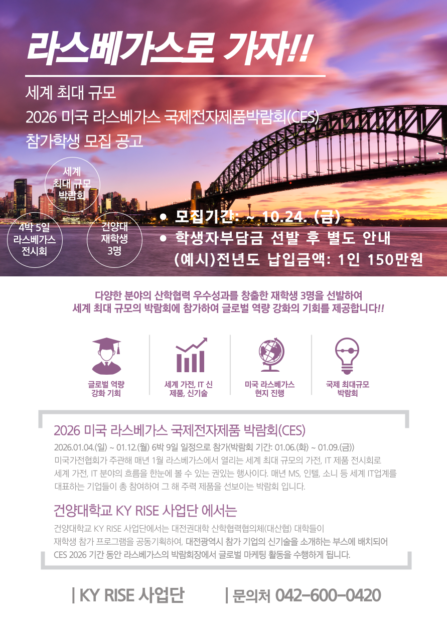 우리 대학의 KY RISE 사업단에서는 대전권 대학 산학협의체와 공동기획으로 아래와 같이 "2026 미국 라스베가스 국제전자제품박람회(CES)" 에 참가할 학생을 모집하고자 합니다.