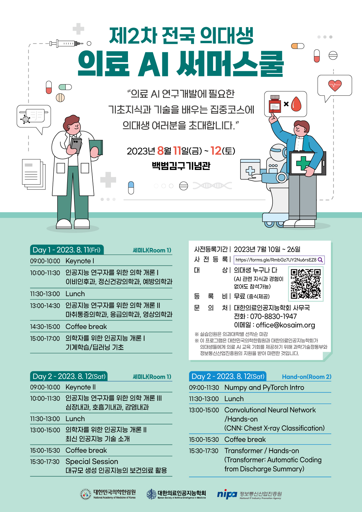 『 제2차 전국의대생 의료 AI 써머스쿨 참가 안내 』글의 상세내용을 확인하는 표로 제목, 부서명, 등록일, 조회, 첨부, 내용으로 나뉘어 설명합니다.