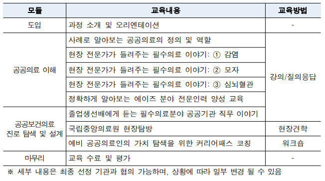 국립중앙의료원 공공보건의료교육훈련센터 주관 2025년 「미래 공공의료인력 양성을 위한 대학생 커리어패스 코칭 캠프(의과대학)」에 참여할 학생을 모집하오니, 관심있는 학생은 아래와 같이 신청 바랍니다.