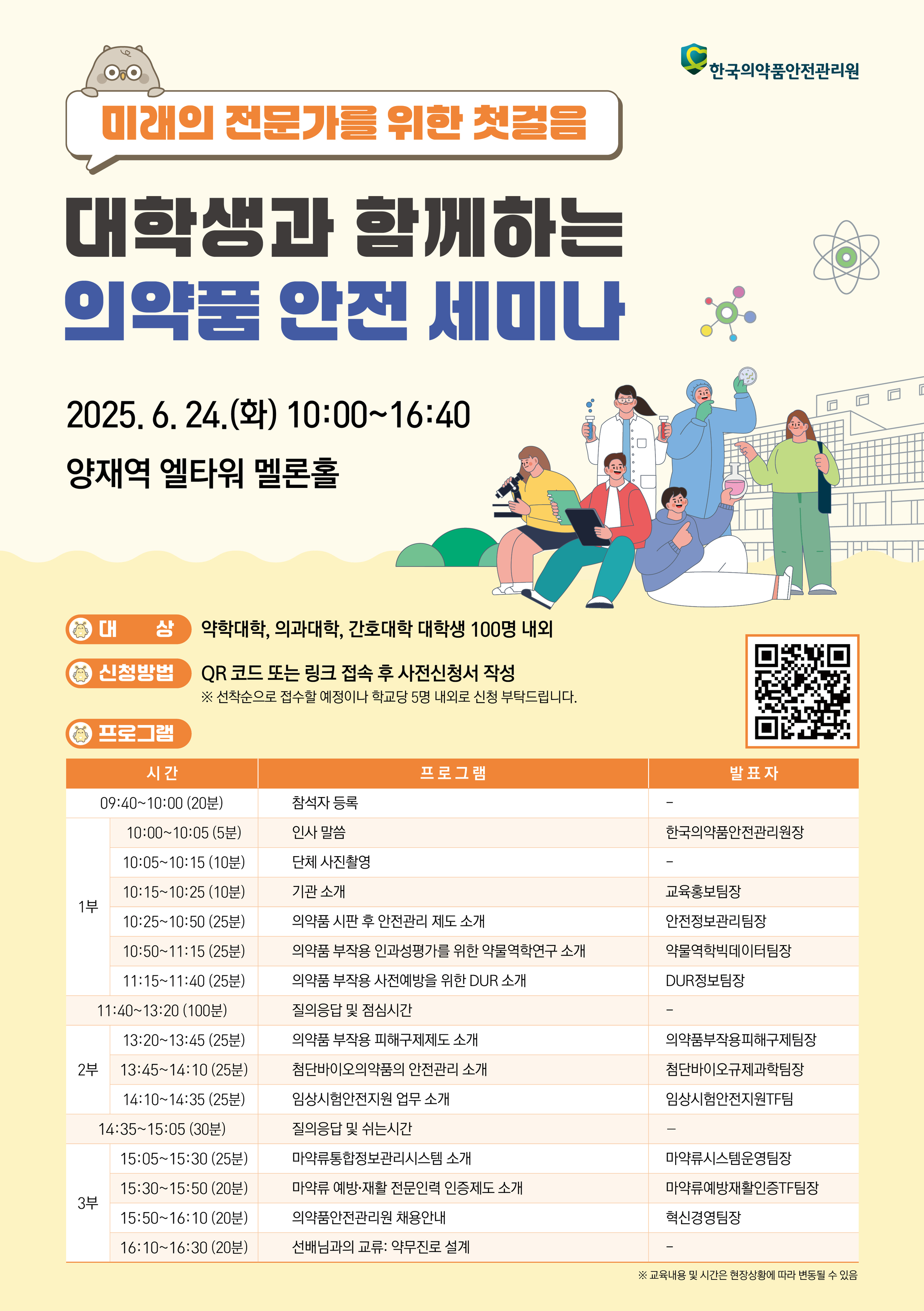 『 미래의 전문가를 위한 첫걸음: 대학생과 함께하는 의약품 안전 세미나 신청 안내 』글의 상세내용을 확인하는 표로 제목, 부서명, 등록일, 조회, 첨부, 내용으로 나뉘어 설명합니다.