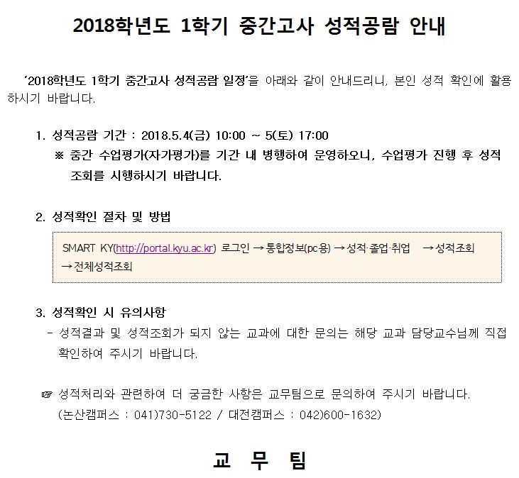 제목 | 2018학년도 1학기 중간고사 성적공람 안내 | ||||