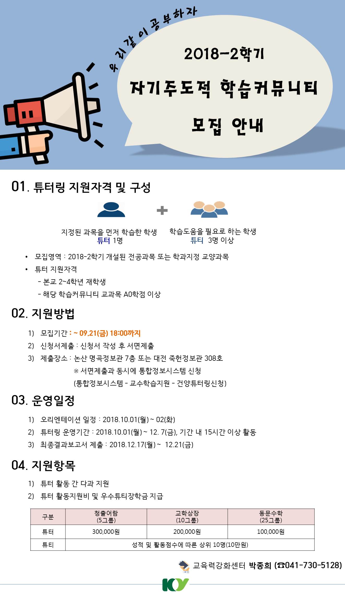 제목 | 2018-2학기 자기주도적학습커뮤니티(튜터링)모집 안내 | ||||