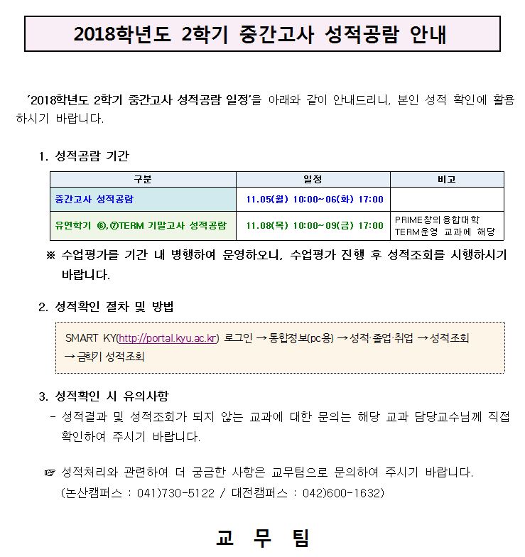 제목 | 2018학년도 2학기 중간고사 성적공람 안내 | ||||