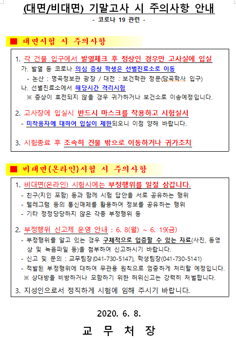 제목 | 2020-1학기 기말고사 시행 간 주의사항 안내 | ||||