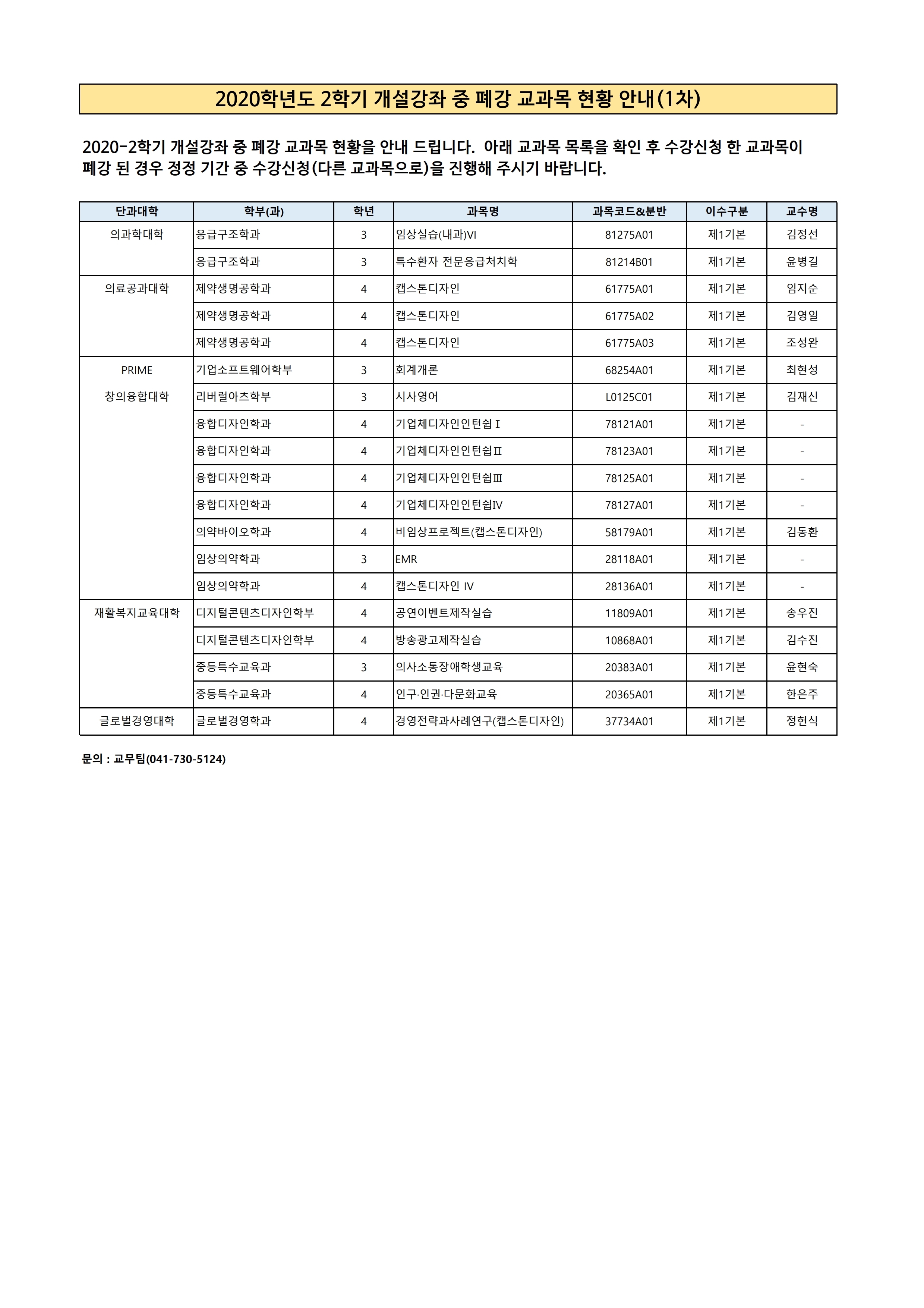 제목 | 2020-2학기 개설강좌 중 폐강 교과목 현황 안내(1차) | ||||
