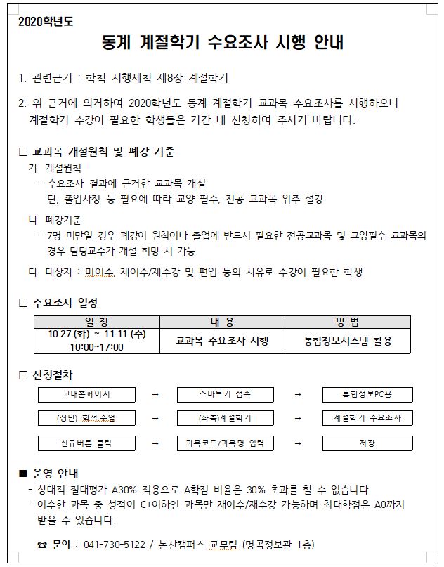 제목 | 2020학년도 동계 계절학기 수요조사 시행 안내 | ||||