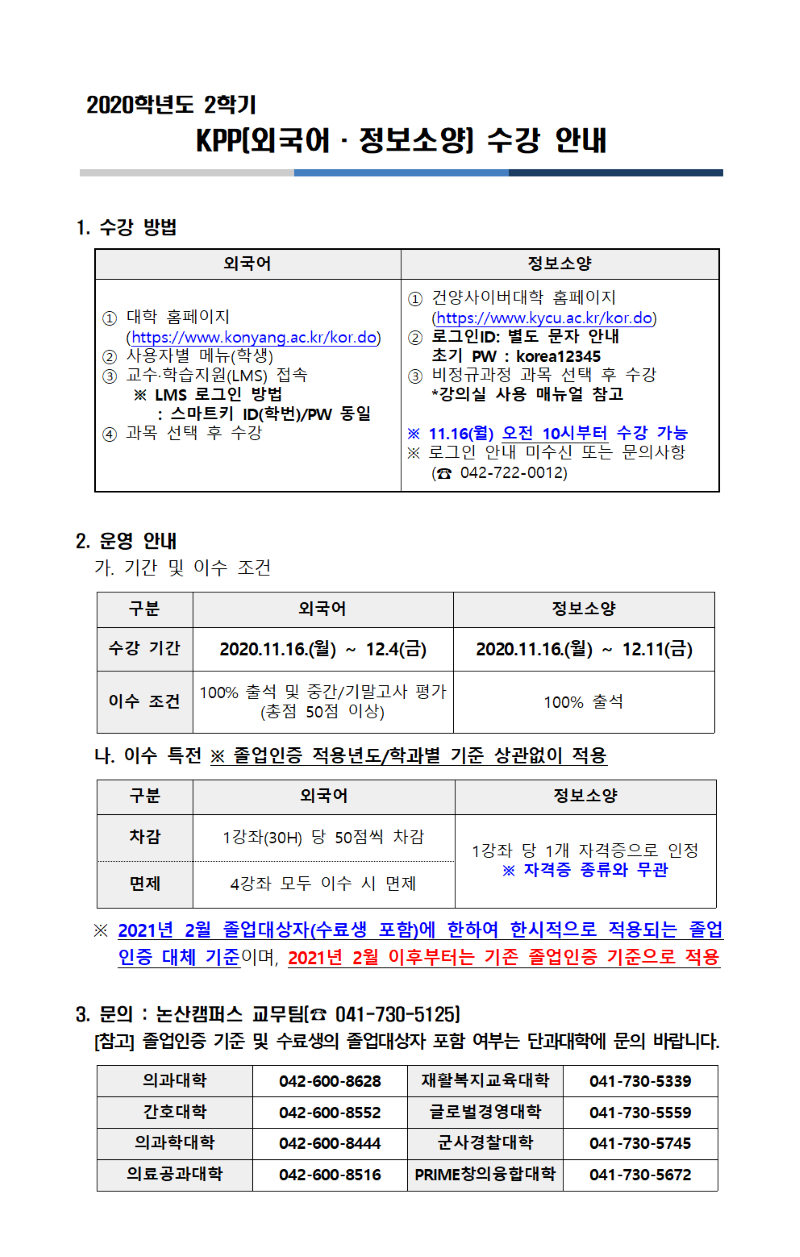 제목 | 2020학년도 2학기 KPP(외국어·정보소양) 수강 방법 안내 | ||||