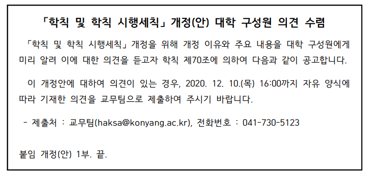 제목 | 학칙 및 학칙 시행세칙 개정(안) 대학 구성원 의견 수렴 | ||||