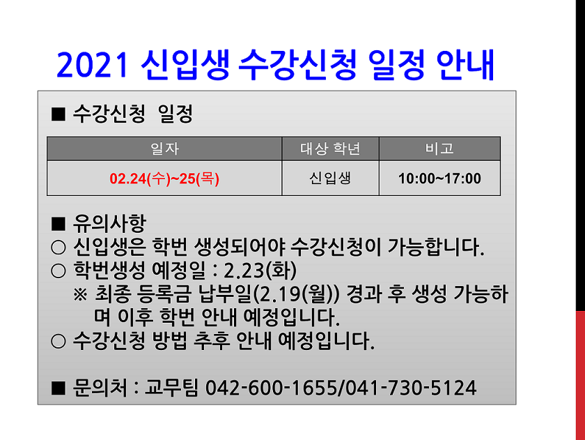 제목 | 2021 신입생 수강신청 일정 안내 | ||||
