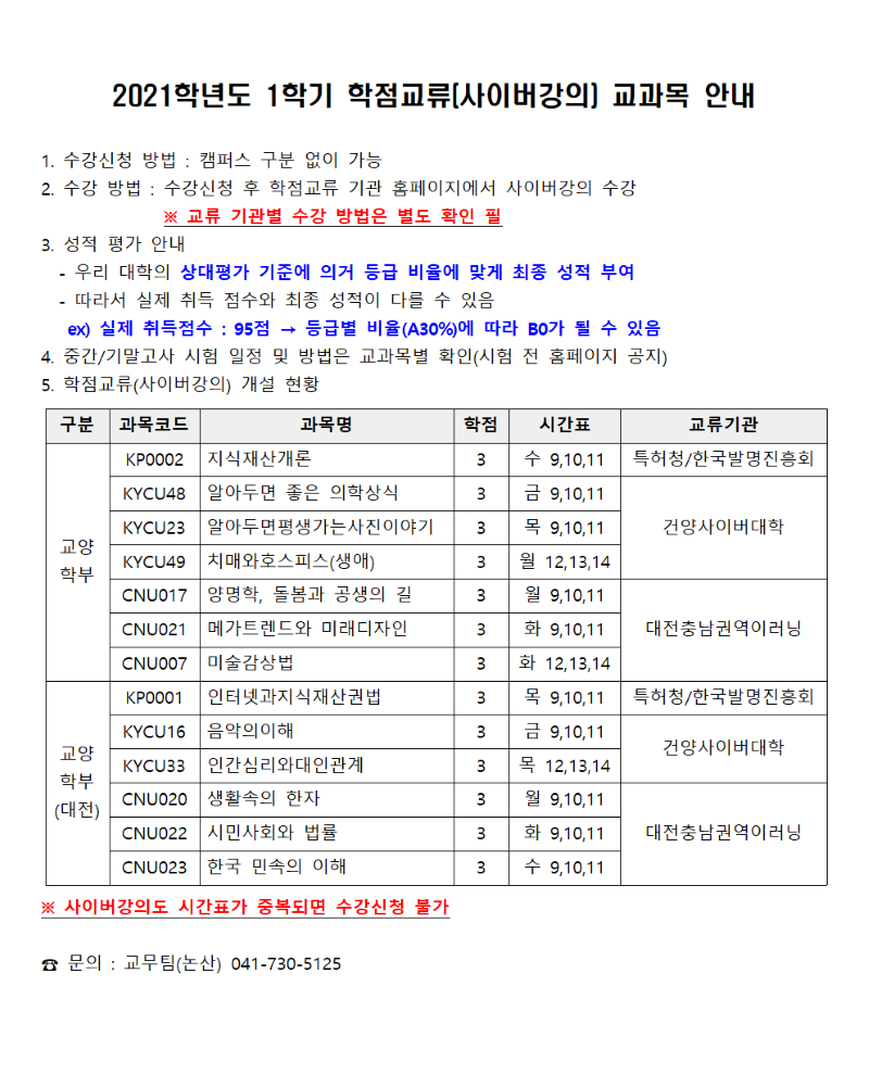 제목 | 2021학년도 1학기 학점교류(사이버강의) 교과목 안내 | ||||