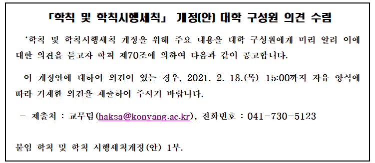 제목 | 학칙 및 학칙시행세칙(제26조 등) 개정(안) 대학 구성원 의견 수렴 안내 | ||||