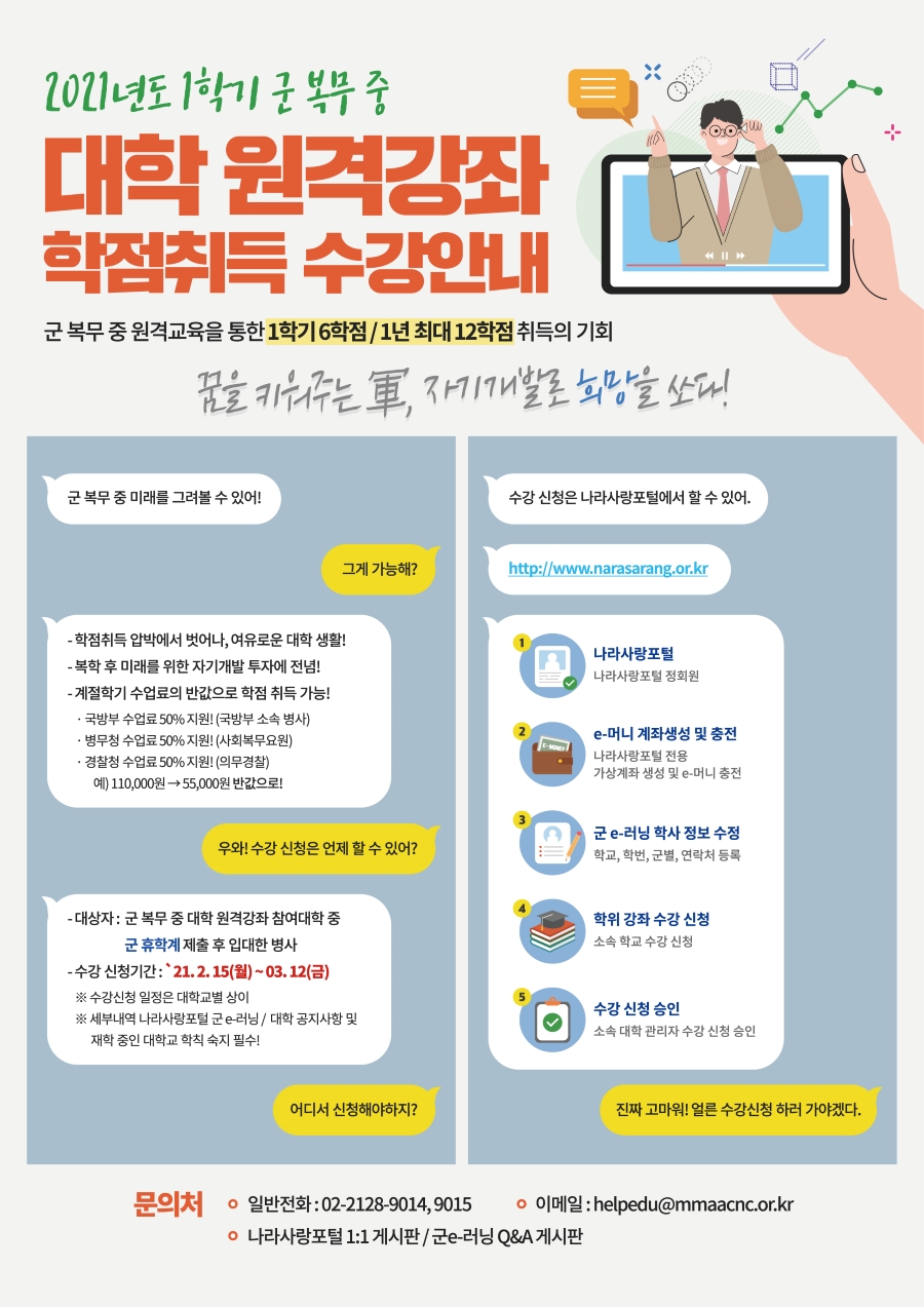 제목 | 2021학년도 1학기 군 복무 중 대학 원격강좌 학점취득 수강안내(군e러닝) | ||||