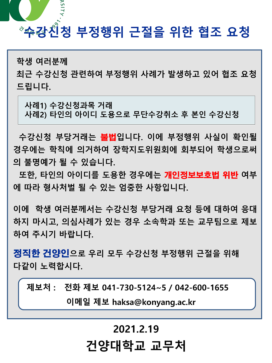 제목 | 수강신청 부정행위 근절을 위한 협조 요청 | ||||