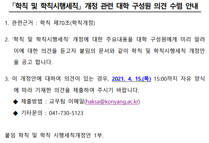 제목 | 학칙(시행세칙) 개정 관련 구성원 의견 수렴 안내 | ||||