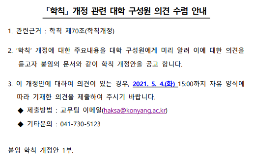 제목 | 학칙 개정(안) 대학 구성원 의견 수렴 안내(4) | ||||