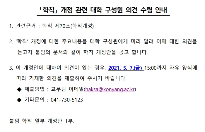 제목 | 학칙 개정(안) 대학 구성원 의견 수렴 안내(6) | ||||