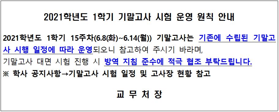 제목 | 2021학년도 1학기 15주차 기말고사 시험 운영 원칙 안내 | ||||