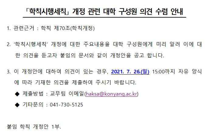 제목 | 학칙시행세칙 개정 관련 구성원 의견 수렴 안내 | ||||