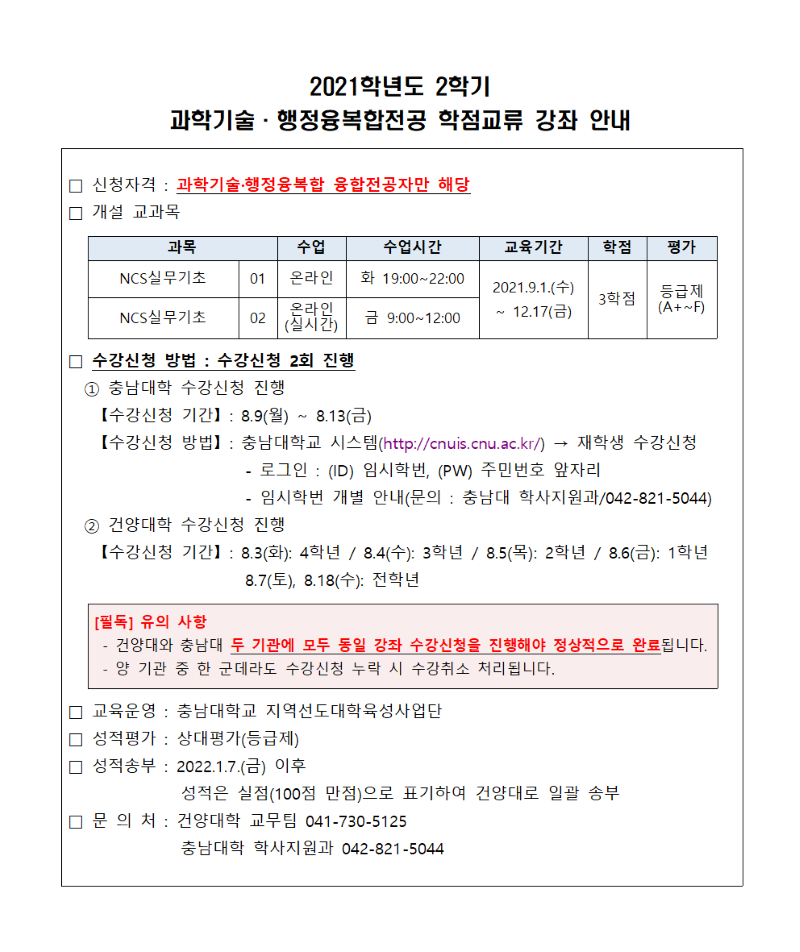 제목 | [학점교류] 2021학년도 2학기 과학기술·행정융복합 융합전공 교류 강좌 안내 | ||||