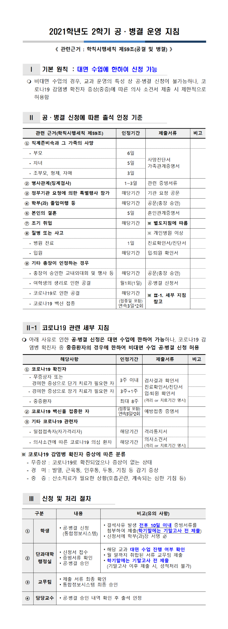 제목 | 2021학년도 2학기 공·병결 운영 지침 안내 | ||||
