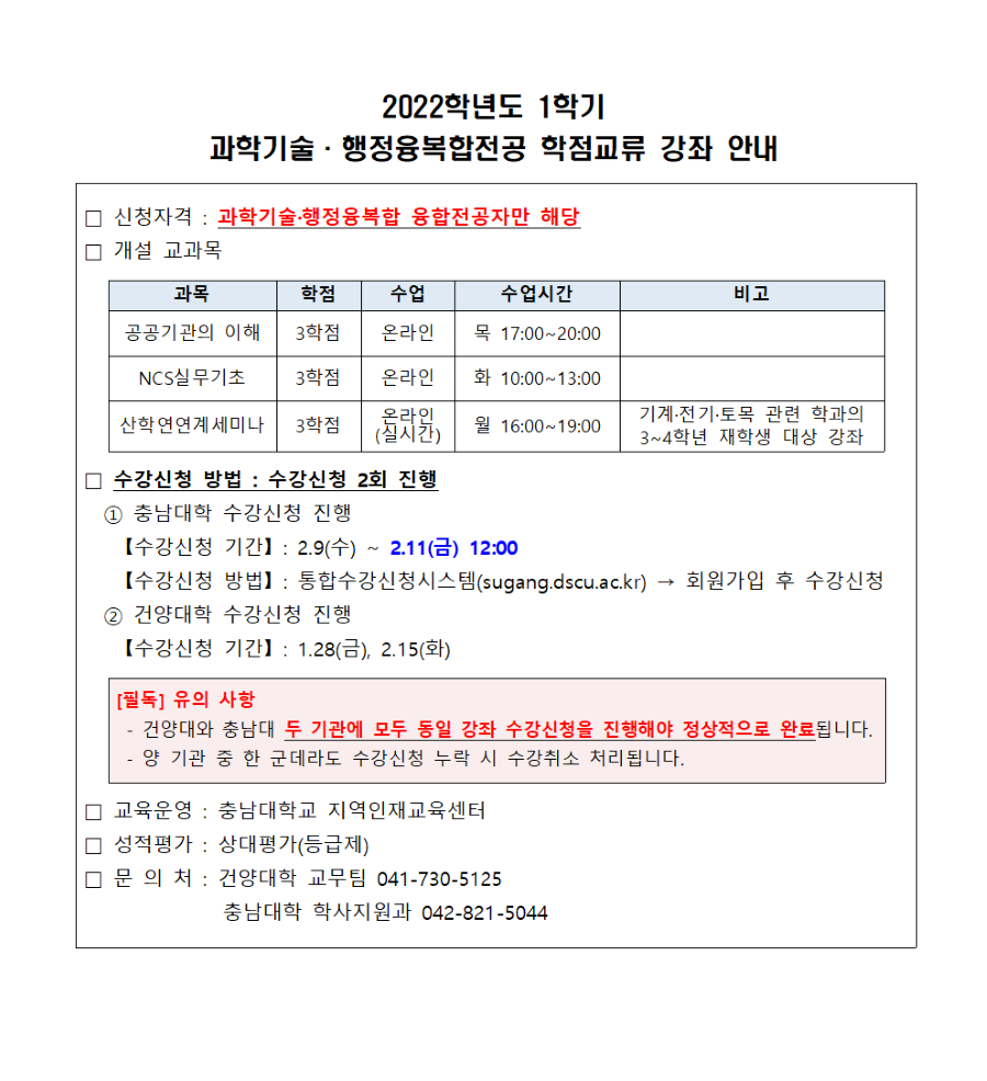 ★ 추가 수강신청 및 정정 기간 안내 ① 충남대학 수강신청 정정기간 : 3.7(월) ~ 3.10(목) [수강신청 방법] : 통합수강신청시스템(http://sugang.dscu.ac.kr/) → 회원가입 후 수강신청 ② 건양대학 수강신청 정정기간 : 3.2(수) ~ 3.8(화) ★ 과학기술행정융복합 학점교류 수강신청은 충남대/건양대 각각 진행해야 합니다. 수강신청을 완료하지 못한 학생은 대학별 수강신청 정정기간에 완료하시기 바랍니다.