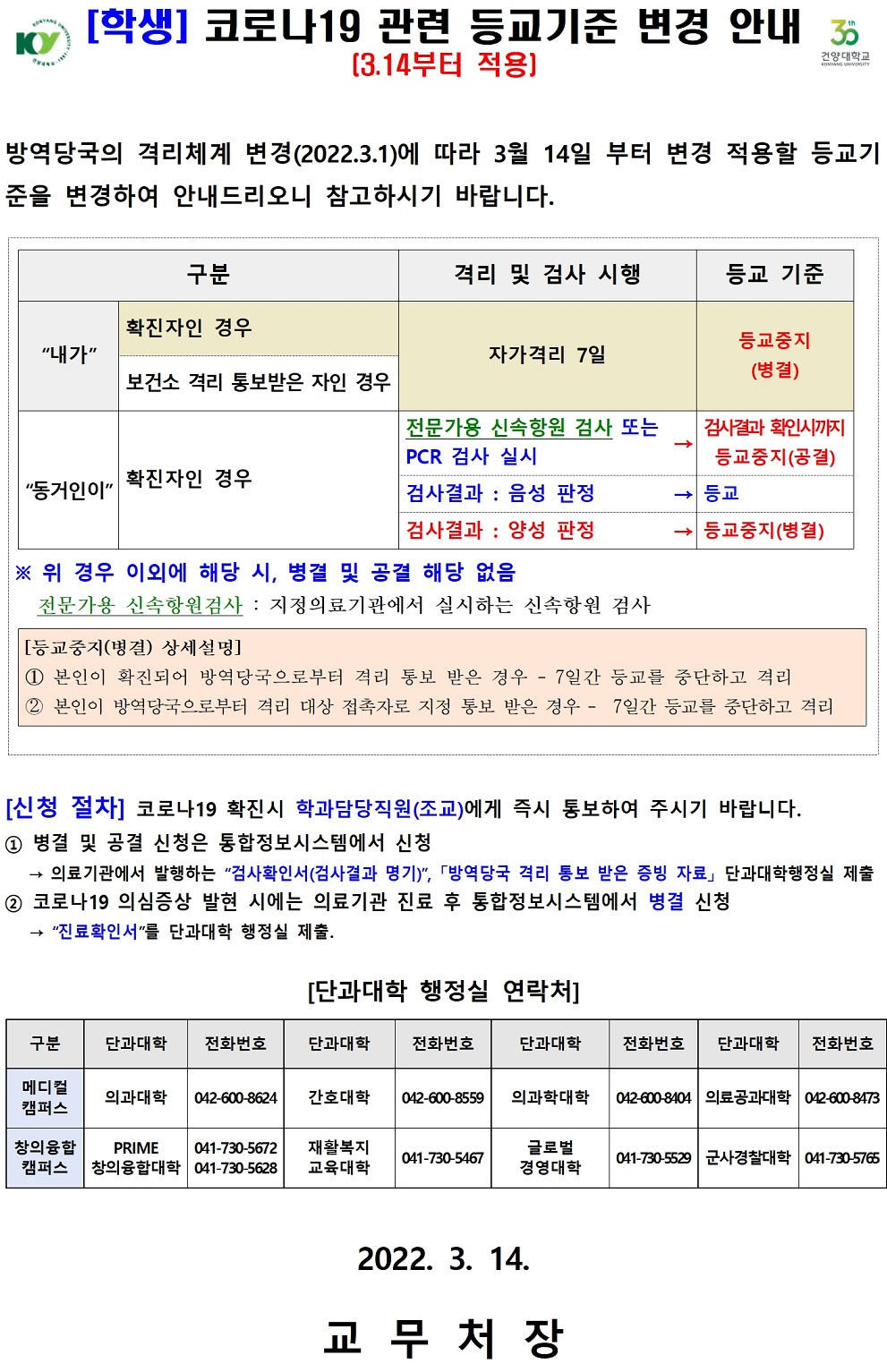 제목 | 코로나19 관련 등교기준 변경 사항 안내(3.14 부터 적용) | ||||