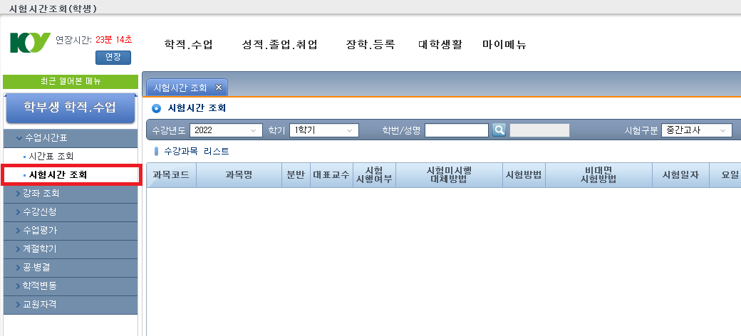 2. 교과목별 시험시간표 확인 방법 가. 확인 경로 : 통합정보시스템 로그인 → 학적.수업 → 수업시간표 → 시험시간 조회
