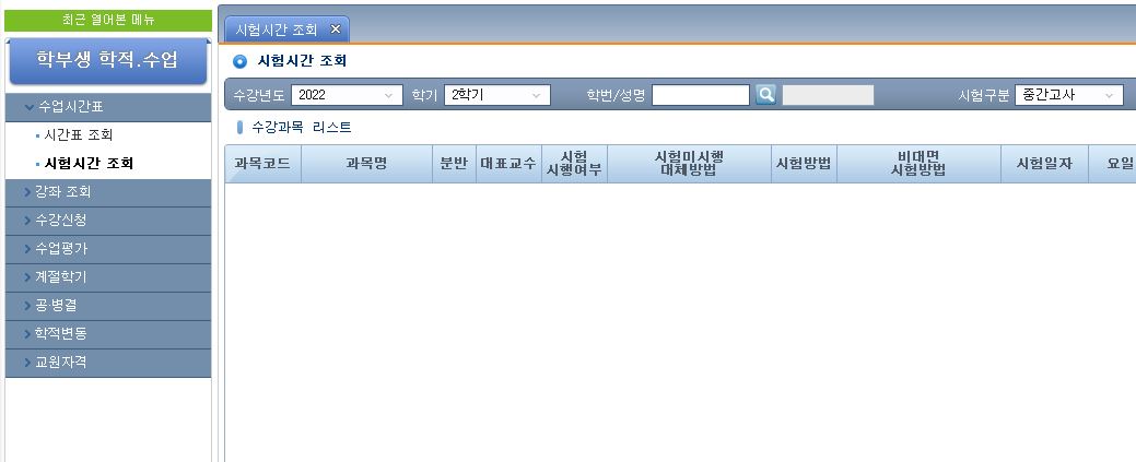 2. 교과목별 시험시간표 확인 방법 가. 경로 : 통합정보시스템 로그인 → 학적.수업 → 수업시간표 → 시험시간 조회