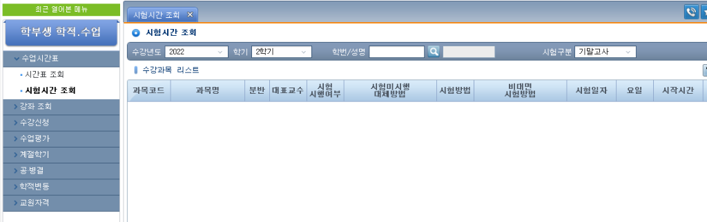 2. 교과목별 시험시간표 확인 방법 가. 확인경로 : 통합정보시스템 로그인 → 학적.수업 → 수업시간표 → 시험시간 조회