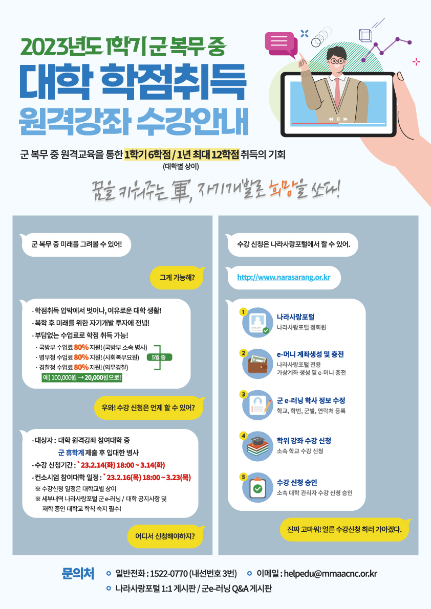 제목 | 2023-1학기 군 복무중 학점취득(군e러닝) 원격강좌 수강안내 | ||||