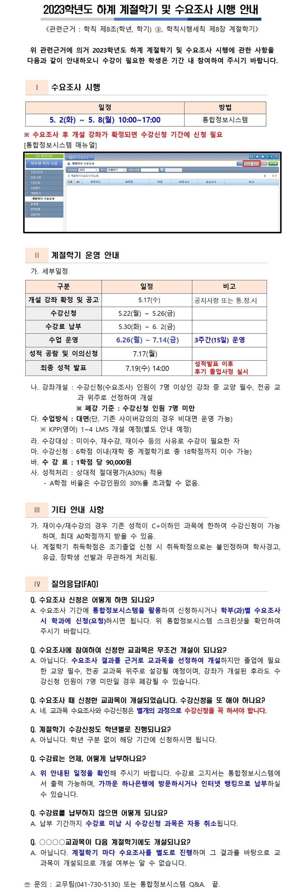 제목 | 2023학년도 하계 계절학기 및 수요조사 시행 안내 | ||||