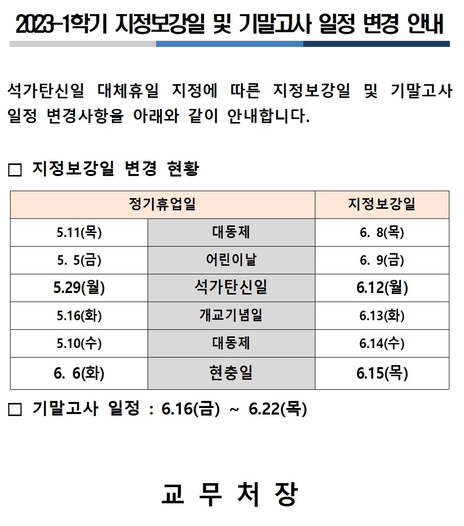 지정보강일 및 기말고사 일정 변경 안내 석가탄신일 부처님오신날 지정보강일 기말고사 대동제 어린이날 개교기념일 현충일 휴업일 대체휴일