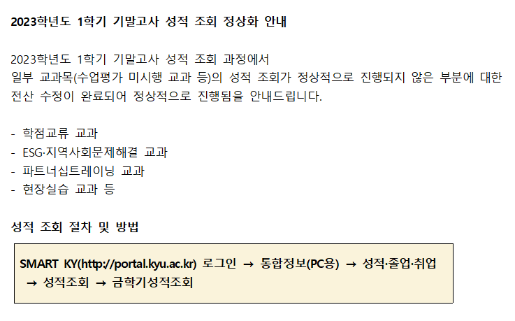 제목 | 2023학년도 1학기 기말고사 성적 조회 정상화 안내 | ||||