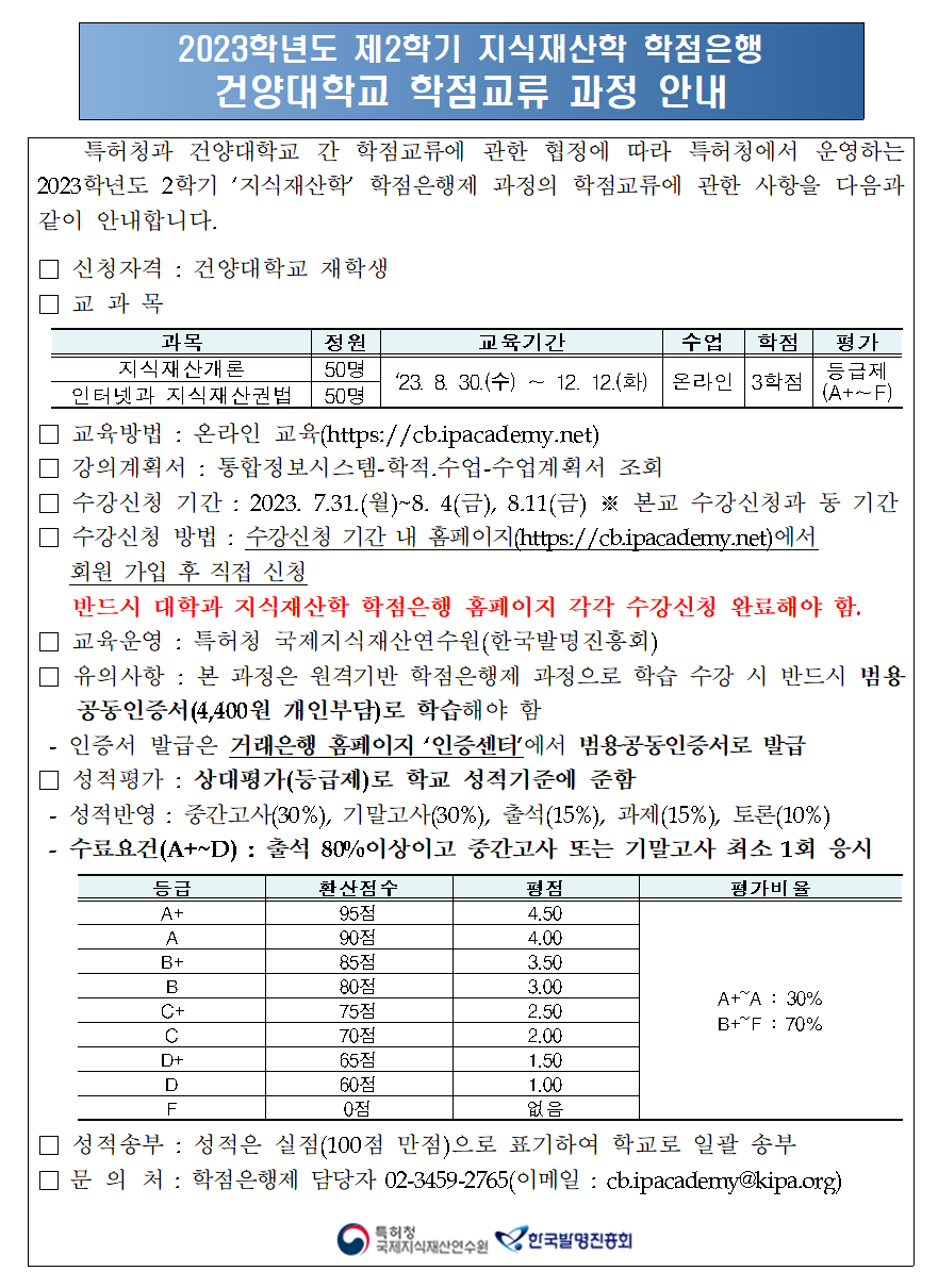제목 | [학점교류] 2023학년도 2학기 특허청 지식재산학 학점교류 수강 안내 | ||||