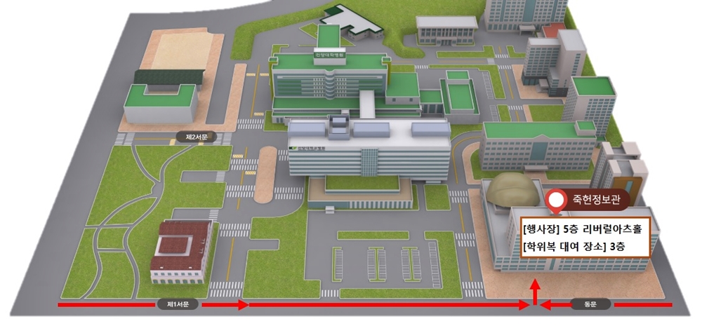 2022학년도(제29회) 후기 학위수여식 안내 대학생활의 마지막이자 새로운 시작! 졸업을 진심으로 축하드립니다! 졸업생 여러분의 새로운 시작을 응원하고자 2022학년도 후기 학위수여식을 다음과 개최하오니 많은 참여 부탁드립니다. 1. 일시 : 2023. 8. 17(목) 10:30~11:10 2. 장소 : 리버럴아츠홀(메디컬캠퍼스 죽헌정보관 5층) 3. 학위복대여 가. 대여시간 및 장소 : 09:00~10:00 / 죽헌정보관 3층 나. 대여료 : (학부) 10,000원 / (대학원) 20,000원 4. 학위수여식 참석 안내 □ 학위수여식 참석자는 10:20분까지 착석 부탁드립니다. □ 행사 종료 후 단상 위에서 자유로운 기념촬영이 가능하오니 행사가 끝날때까지 좌석에서 대기하여 주시기 바랍니다. □ 행사장 주변 교통혼잡이 예상되오니 가급적 대중교통을 이용 바랍니다. □ 학위증 및 상장 등 수령은 학위수여식 종료 후 학과별 별도 장소에서 수령합니다. □ 증명서 발급 : 학교 홈페이지 인터넷 발급 및 로비 무인발급기를 이용 바랍니다. 5. 문의 □ 학부생 : 교무팀(041-730-5130) / 대학원생 : 대학원(042-600-1650) [메디컬캠퍼스 약도] |