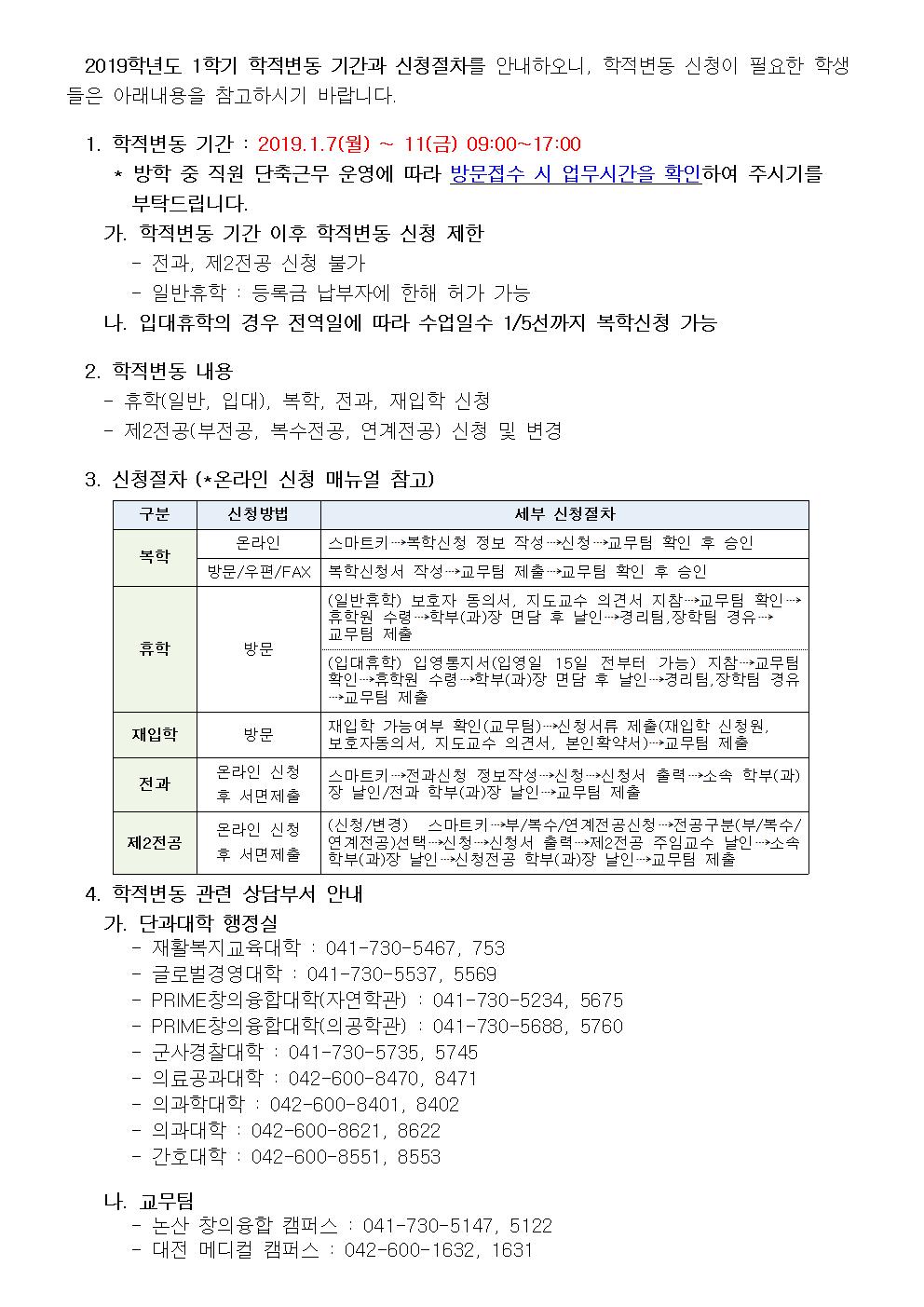 제목 | 2019학년도 1학기 학적변동 기간 및 신청절차 안내 | ||||