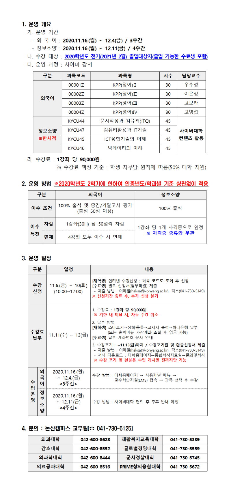 - 수강신청 기간(연장) : ~11.13(금) 13:00 까지 - 수강신청 방법 : 별도 신청서(첨부파일) 제출 이메일(haksa@konyang.ac.kr) 또는 팩스(041-730-5149) - 수강료 : 1강좌 당 90,000원 / 납부 방법은 신청서 접수 후 개별 문자 안내 ※ 수료생의 경우, KPP 수강신청 후 반드시 단과대학에 졸업대상자 포함여부를 확인하셔야 합니다.