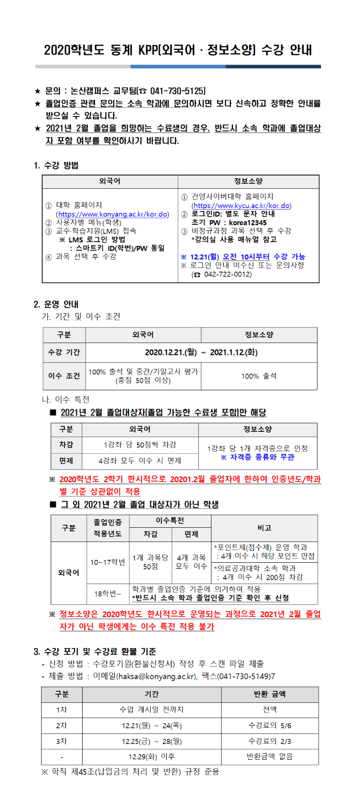 제목 | 2020학년도 동계 KPP(외국어·정보소양) 수강 방법 안내 | ||||