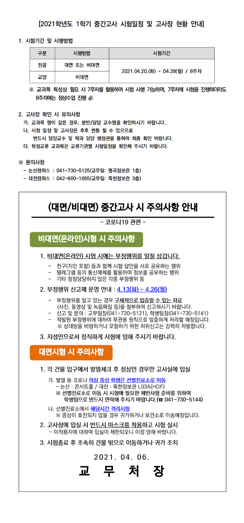 제목 | 2021학년도 1학기 중간고사 시험 일정 안내(4차) | ||||