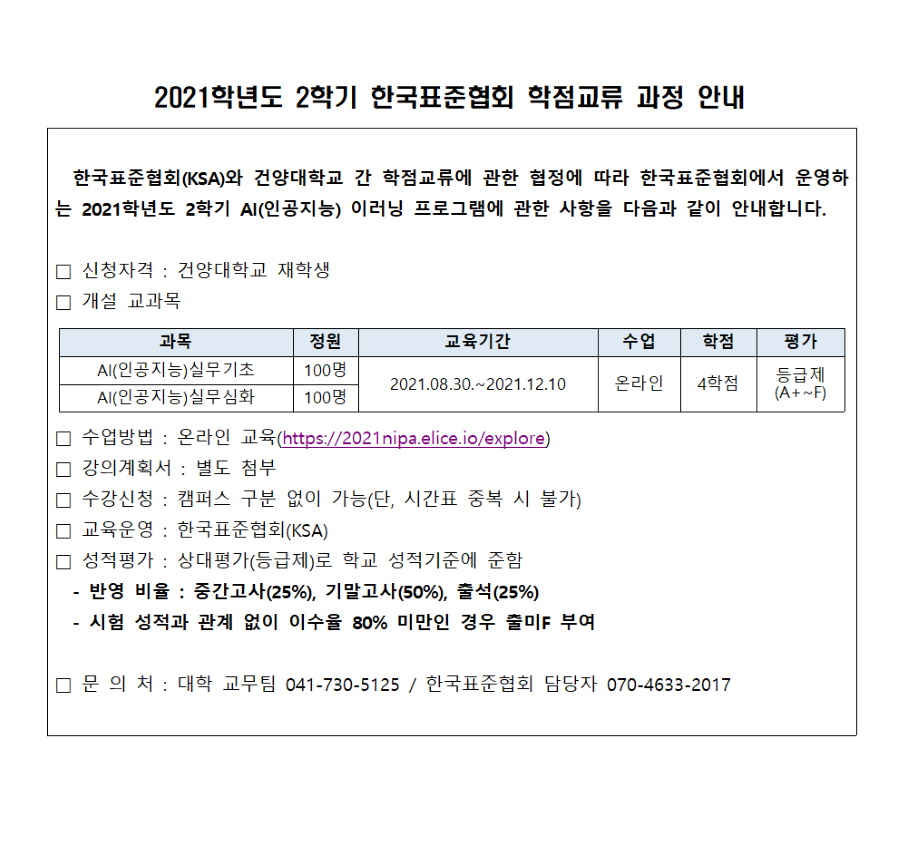 제목 | [학점교류] 2021학년도 2학기 한국표준협회 학점교류 과정 안내 | ||||