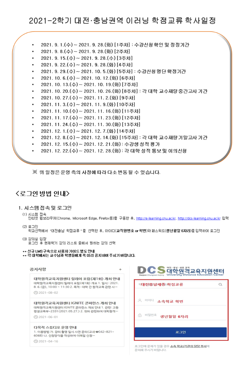 제목 | [학점교류] 2021학년도 2학기 CNU 학점교류 학사일정 및 수강 방법 안내 | ||||