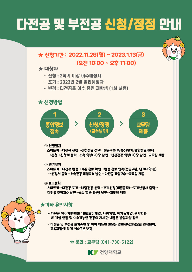 제목 | 2023-1학기 다전공 및 부전공 신청/정정 기간 안내 | ||||