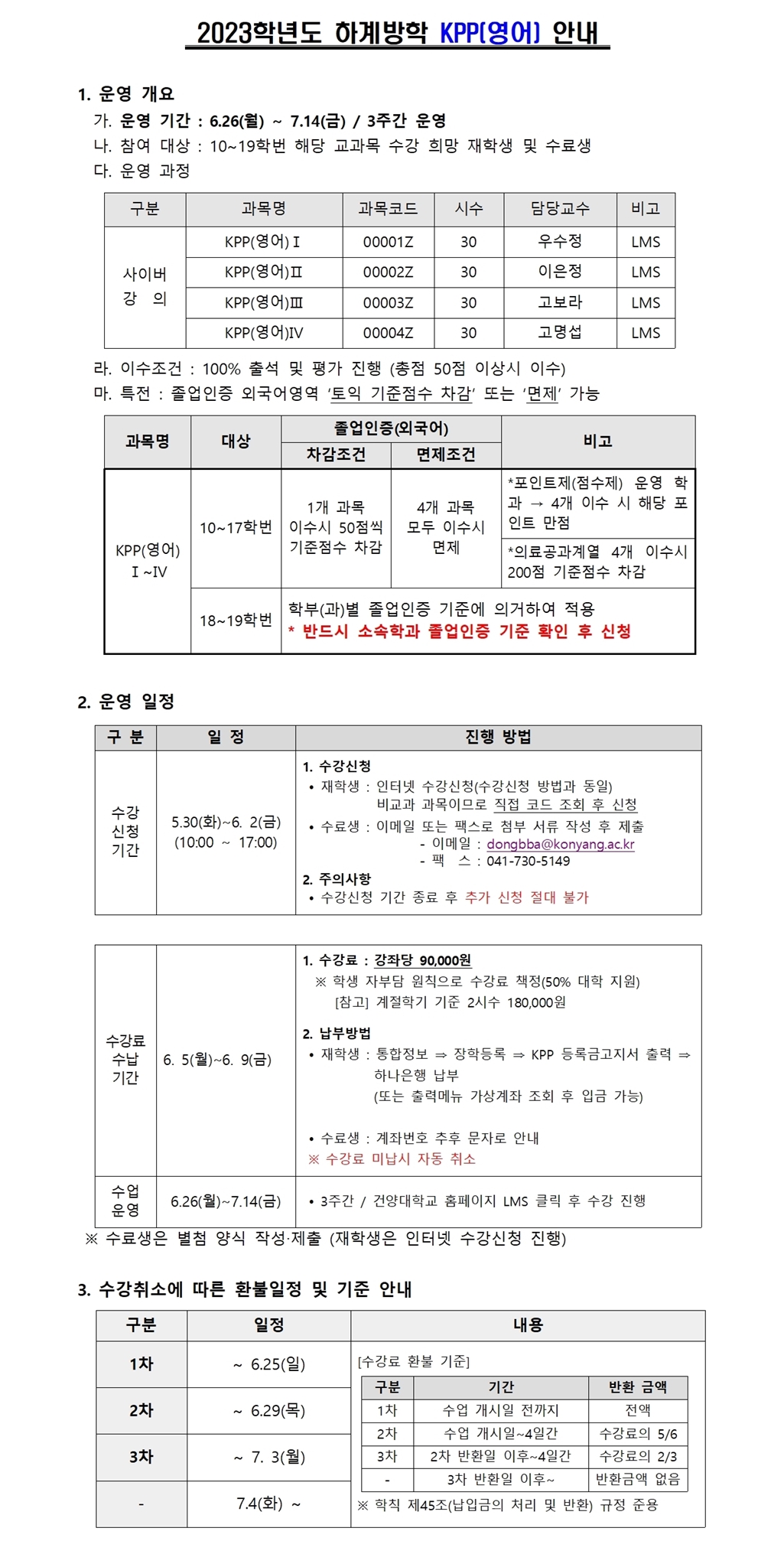 2023학년도 하계방학 KPP(영어) 안내 수강신청 사이버강의 LMS 우수정 이은정 고보라 고명섭 졸업인증 토익 대체 환불 등록금 고지서 출력 납부 수강료 90,000원 수료생 수강취소 참가신청서 환불신청서 붙임