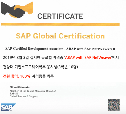 SAP ERP 교육을 전공으로 하는 건양대 기업소프트웨어학부 학생들은 학부 신설이래 처음으로 실시한 ABAP Certification 에서 응시생 전원( 3학년 10명 )이 100% 합격하는 쾌거를 이루었습니다. ( 관련기사 : 건양대 기업소프트웨어학부, 'SAP 국제공인자격증' 전원합격 )
