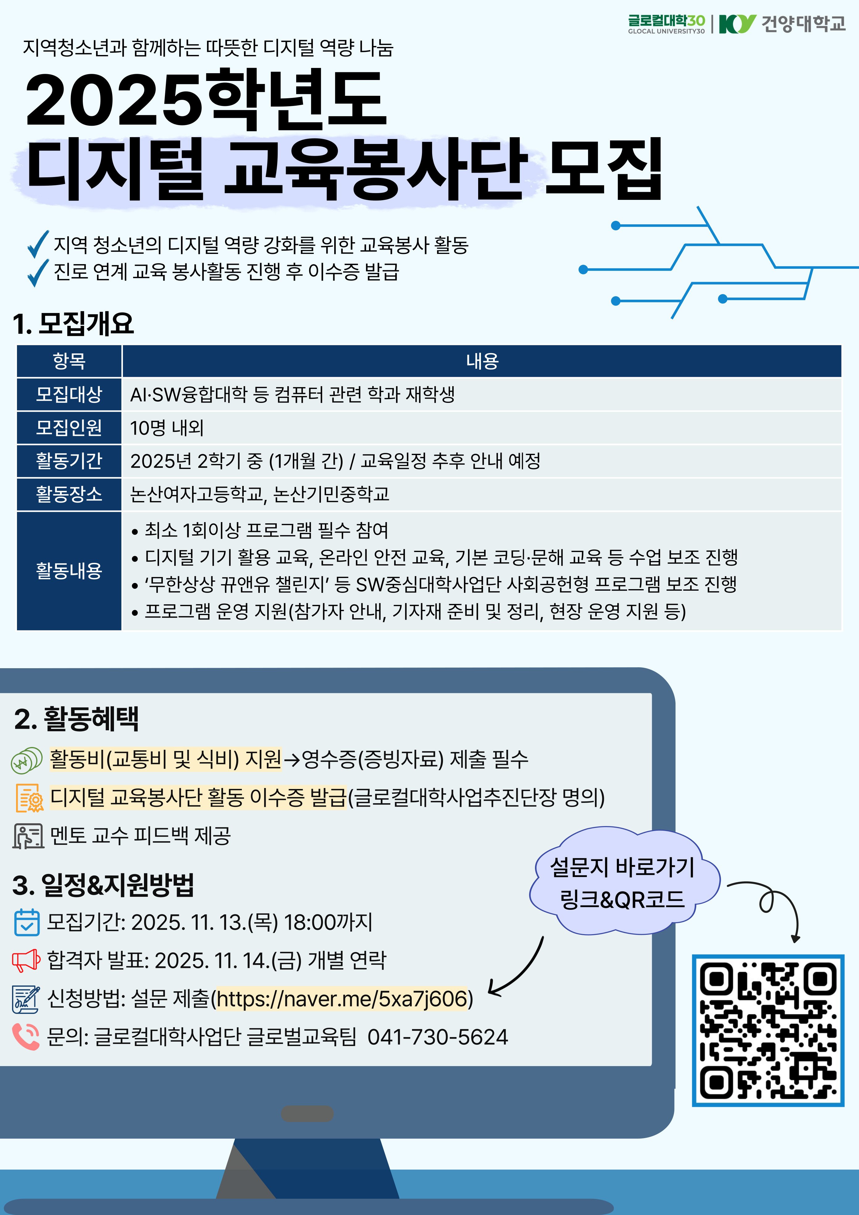 『 2025학년도 디지털 교육봉사단 모집안내 』글의 상세내용을 확인하는 표로 제목, 부서명, 등록일, 조회, 첨부, 내용으로 나뉘어 설명합니다.