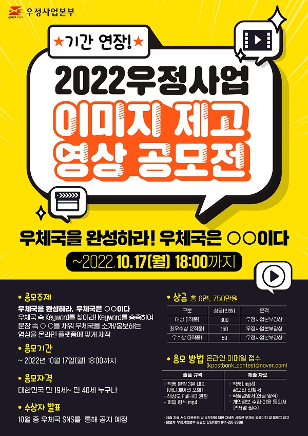 | 제목 | (공모전) 2022 우정사업 이미지 제고 영상 공모전 안내 | ||||