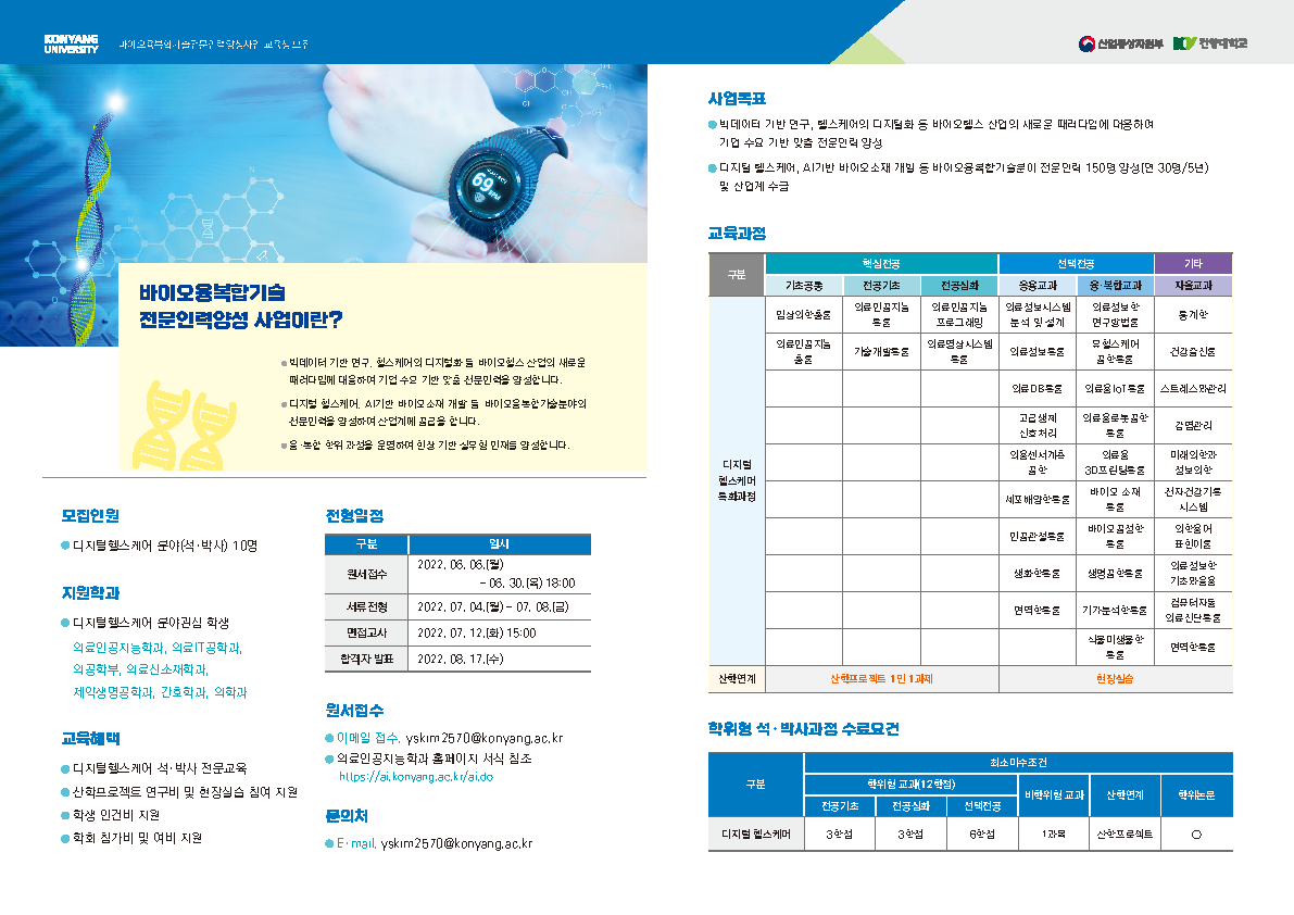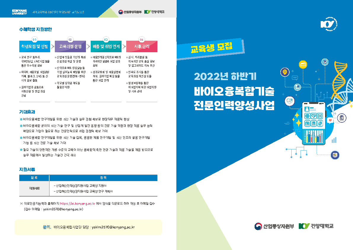 | 제목 | 2022년 하반기 바이오융복합기술전문인력양성 사업 석·박사 학생연구원 모집 공고 | ||||